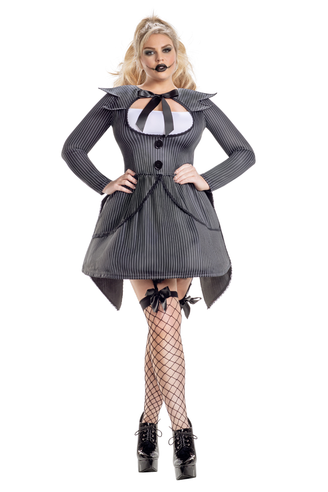 - This delightfully eerie outfit features a pin-striped dress with a sharp pointy collar, complete with whimsical black buttons and charming bow accents