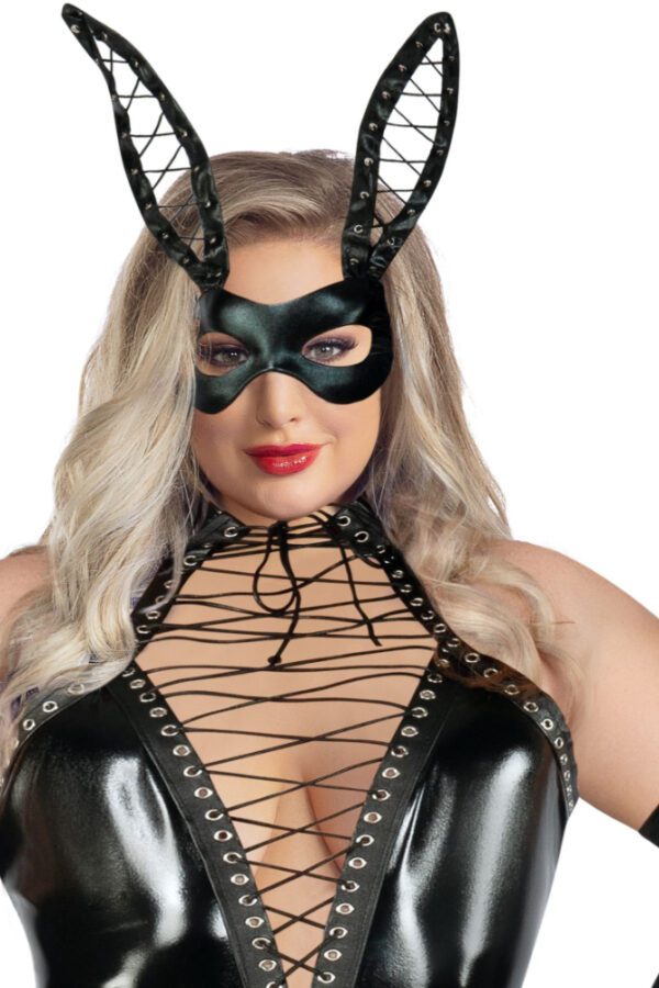 - Complete your look with the mask adorned with lace-up ears and matching gloves for a playful, seductive vibe