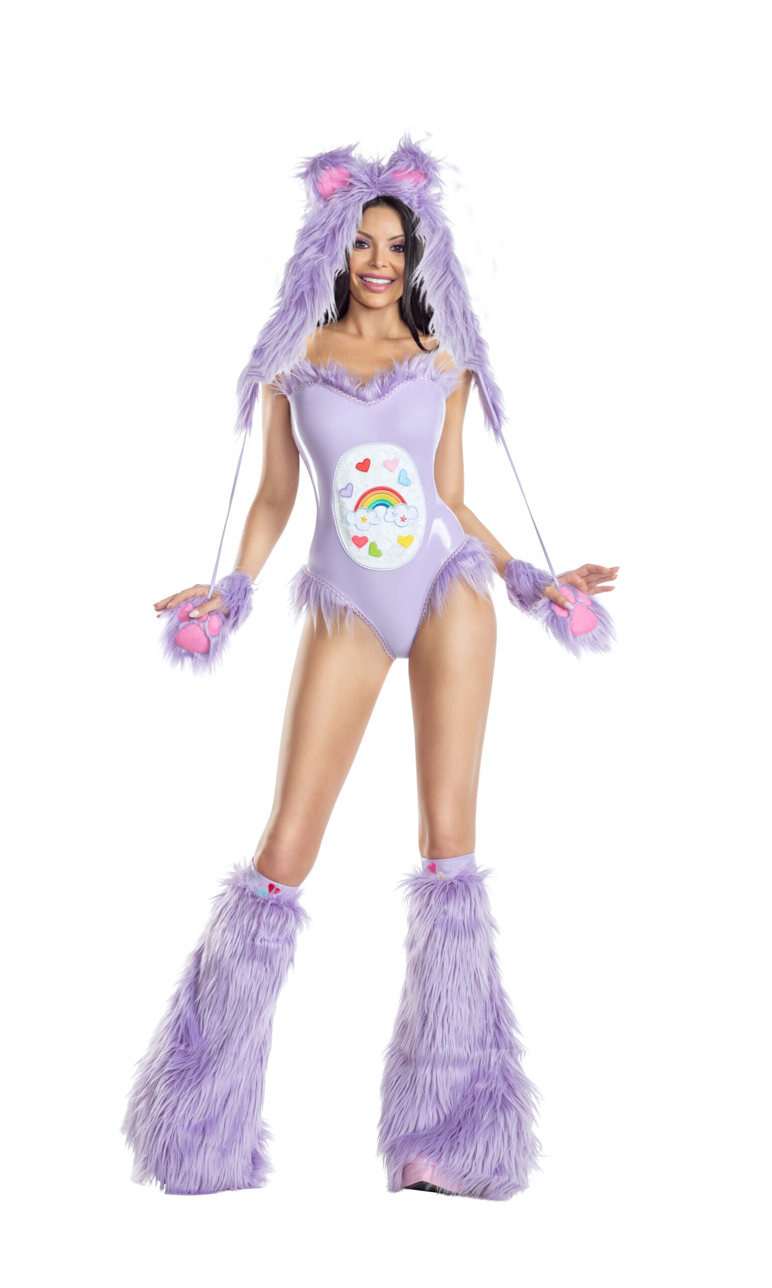 Purple Care Creature stretch vinyl teddy with tummy appliqué details and faux-fur accents. Comes with matching leg warmers and hooded headpiece with ears and paw-detail pom-poms.