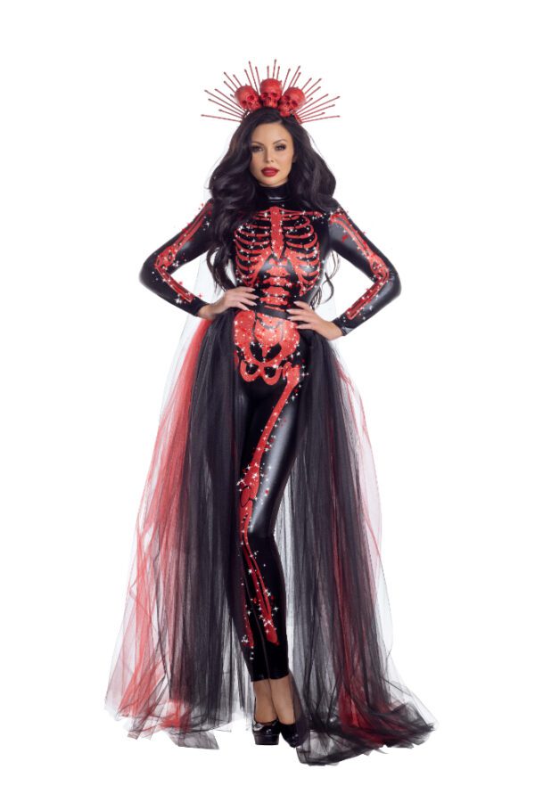 - This black lamé bodysuit, adorned with a striking red glitter skeleton print, is designed to captivate and command