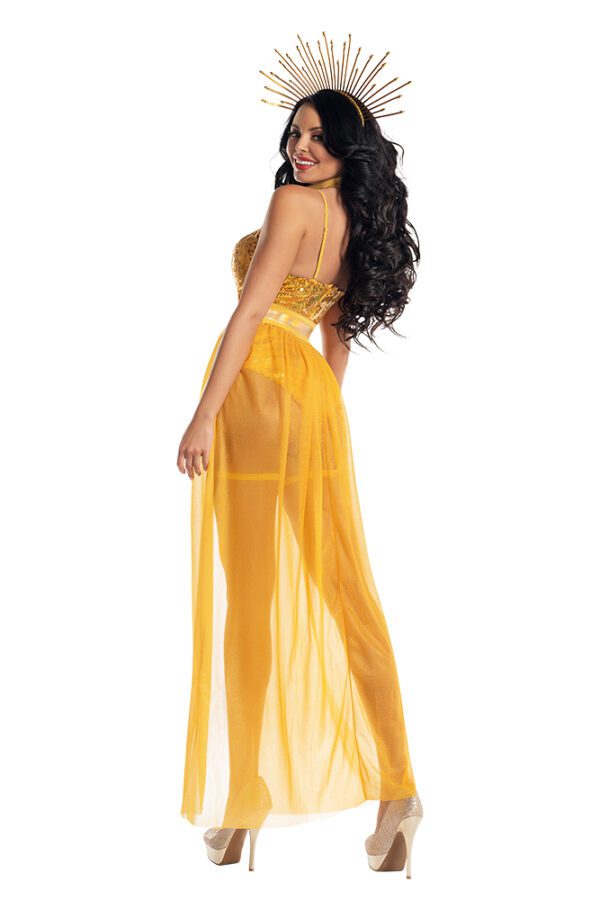 Plus Size Rising Sun Beauty gold sequin teddy with strappy details and attached leg garters